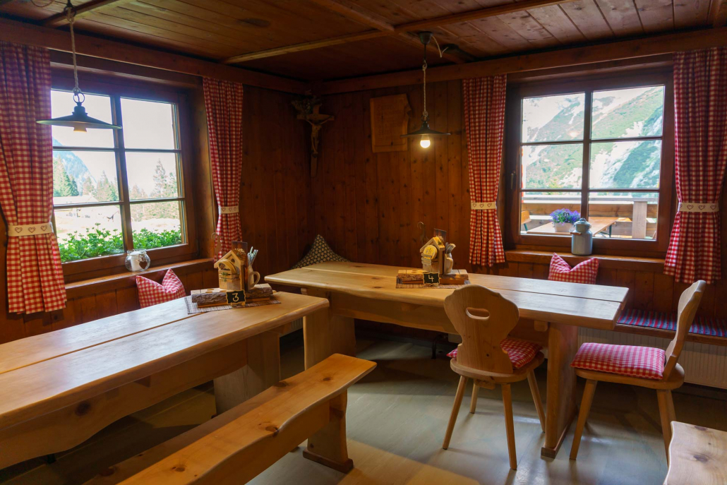 Viele Gäste beneiden die Familie um das Leben an diesem Platz, der wirklich besonders ist. Sie sind hier völlig aus dem Alltag raus und erfahren eingebettet in die steilen Nordwände des Gimpels, der Gehrenspitze und der Köllenspitze nicht nur eine Anderszeit, sondern auch eine digitale Auszeit, denn Handyempfang ist hier Fehlanzeige. Ein ganz und gar analoges Erlebnis: Natur, wohin das Auge reicht. Und wer möchte nicht noch abends auf dem kleinen Balkon oder auf der Terrasse sitzen und den mächtigen Eindruck der steinernen Riesen auf sich wirken lassen, bevor es dann in die frisch gemachten Betten geht? „Ich glaube, geborgen trifft es ganz gut. Das Tal strahlt eine unglaubliche Ruhe aus und zeigt sich über das Jahr immer wieder anders. Es ist so schön, dass ich es gar nicht richtig in Worte fassen kann. Man muss einfach hier durchlaufen und es richtig aufsaugen“, meint Melanie und Matthias ergänzt: „Man entdeckt immer wieder etwas Neues oder eine andere Perspektive, wenn man hier oder da hochläuft. Ich habe mir bei unserem Wechsel zum Hüttendasein auch gewünscht, dass ich einen Ausgleich habe, wenn ich aus der Küche rauskomme. Bei allem Stress mache ich mir immer wieder bewusst, an so einem schönen Platz zu sein und zu arbeiten. Um den Leuten hier oben eine schöne Zeit zu schenken, verzichten wir auf der anderen Seite auch auf vieles, das für andere selbstverständlich ist wie Privatsphäre, fließendes Warmwasser oder Licht in der Nacht.“