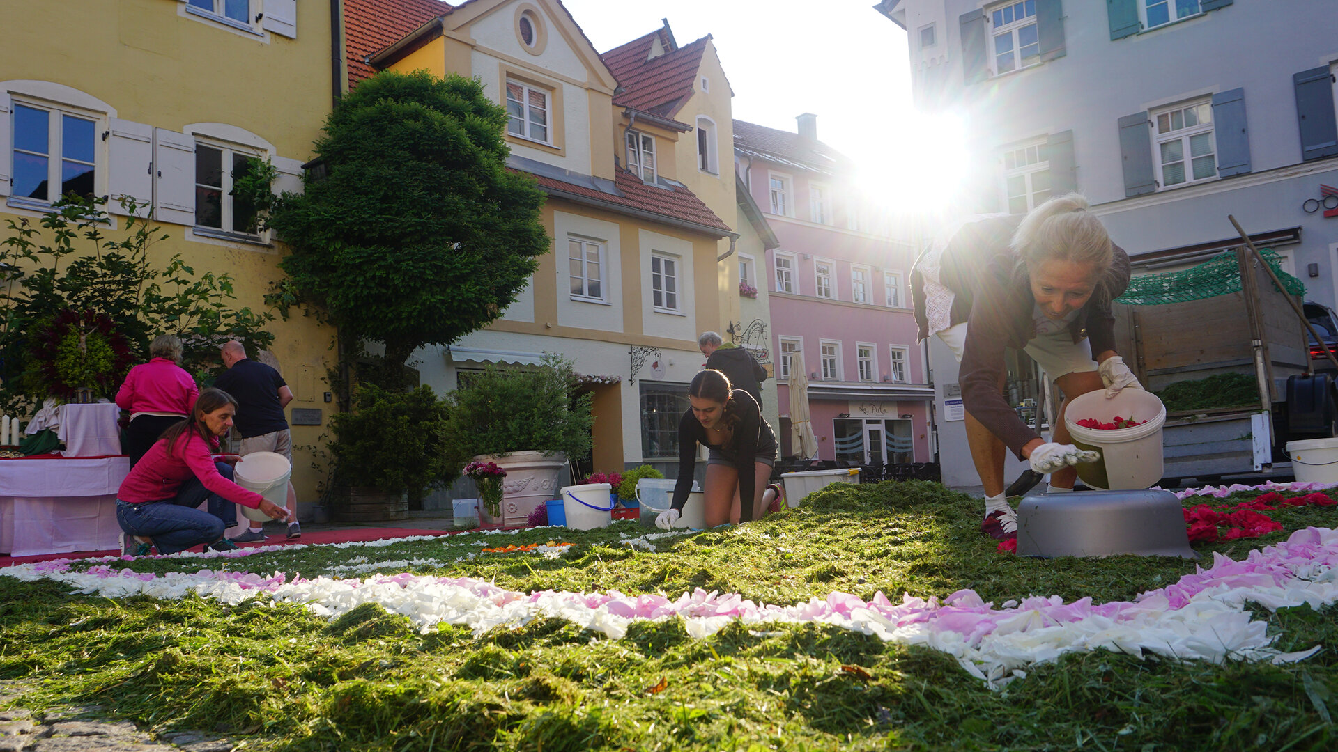 5.00 Uhr an einem Donnerstagmorgen im Juni. Richard Hartmann und ein paar weitere Mitglieder des Trachtenvereins D'Neuschwanstoaner StammFüssen tragen Körbe und Eimer, gefüllt mit Blüten, Blumen und Gras, zum Schrannenplatz in Füssen. Sie haben Großes vor – im wahrsten Sinne des Wortes: Für die Fronleichnamsprozession, die später durch die Altstadt zieht, bauen sie einen Altar auf und legen einen mehreren Meter langen Blumenteppich aus.