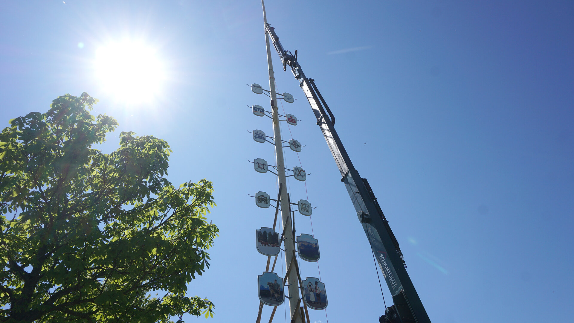 Am Festplatz ist alles bereit, der Baum liegt vor dem Fundament, in das er später eingelassen wird. Mithilfe von unterschiedlich langen Stangenpaaren, sogenannten Scheren, und Seilen wird er nun von 40 Männern Zentimeter für Zentimeter angehoben, indem die Scheren nach und nach umgesetzt werden. Angefangen wird mit einem Kantholz von einem Meter, die längsten Stangen sind 14 Meter lang. Immer auf das Kommando von Florian Grieser hin geht es wieder ein Stück nach oben. Mit reiner Muskelkraft ein wirklich schweißtreibendes Unterfangen. Ein Maibaumhalter und ein Kran sichern den Stamm, damit er nicht hinunterfällt, falls die Stangen einmal abrutschen sollten.