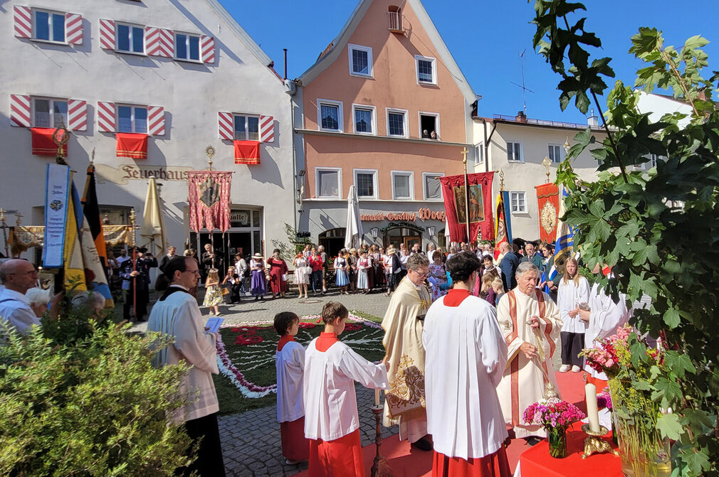 Richard Hartmann erinnert sich noch an die Fronleichnamprozessionen, die er als Kind miterlebt hat. Am Schrannenplatz im Gasthof Krone groß geworden, wartete er immer gespannt in seinem Zimmer, bis unten der Pfarrer, die Honoratioren und viele Kirchgänger vorbei zogen: „Damals haben noch viel mehr Leute teilgenommen und es war nochmal pompöser als heute. Jedes Altstadthaus war beflaggt und es standen Heiligenfiguren in den offenen Fenstern, von denen rote Tücher mit Goldborten an der Fassade hinunterhingen. Für die Altstädter war es eine Ehre und Freude, ihre Häuser zu schmücken, und sie erhofften sich damit Gottes Segen für die Stadt."