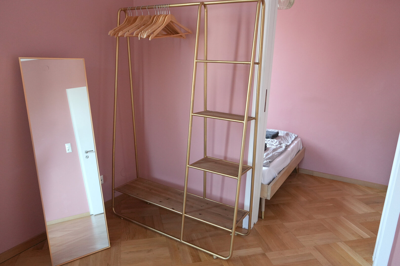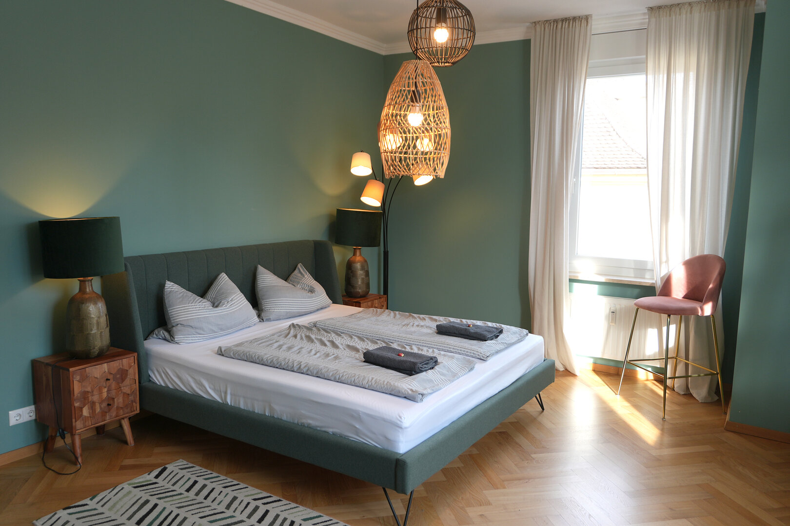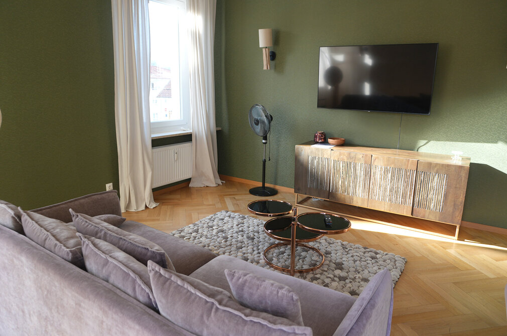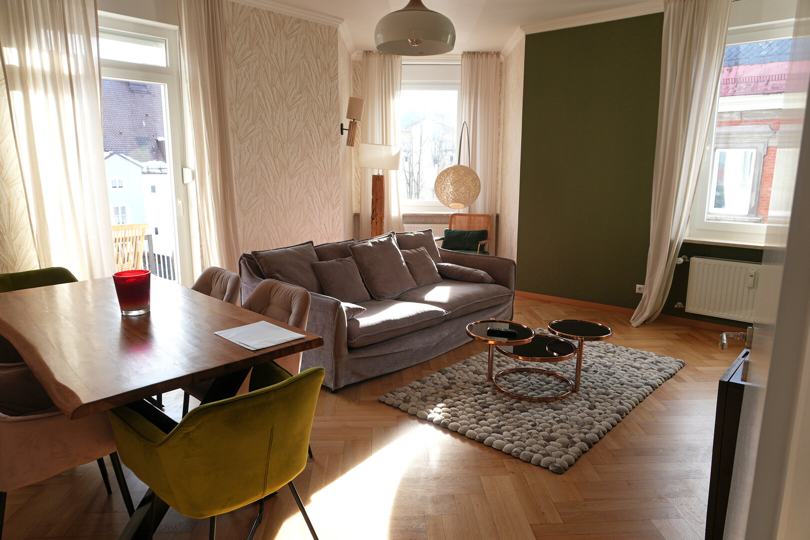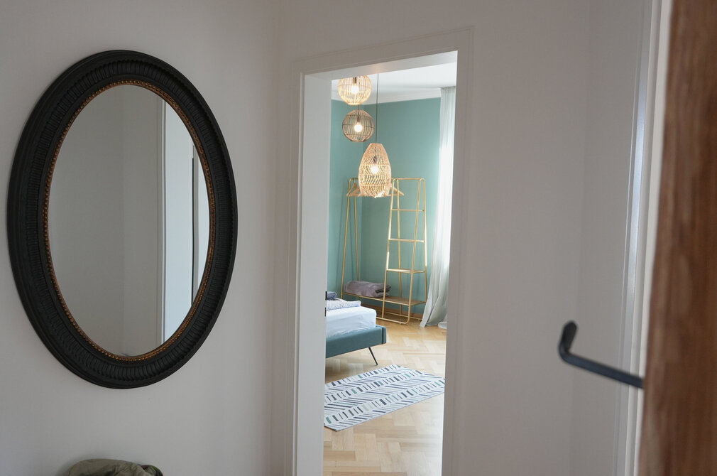 Die hohen Decken, der alte Holzparkett und die vielen Fenster, die das Sonnenlicht in die Räume lassen - sie zaubern Wohlfühlatmosphäre in die 113 Quadratmeter große Wohnung. Kössel verstärkt das mit schlichten, gemütlichen und zugleich stilvollen Möbeln. „Damit der historische Charme des Altbaus ein paar moderne Akzente bekommt, wollte ich alles etwas bunter und ausgefallener einrichten, so wie eine Stadtvilla eben. Da bin ich manchmal ein bisschen waghalsig."