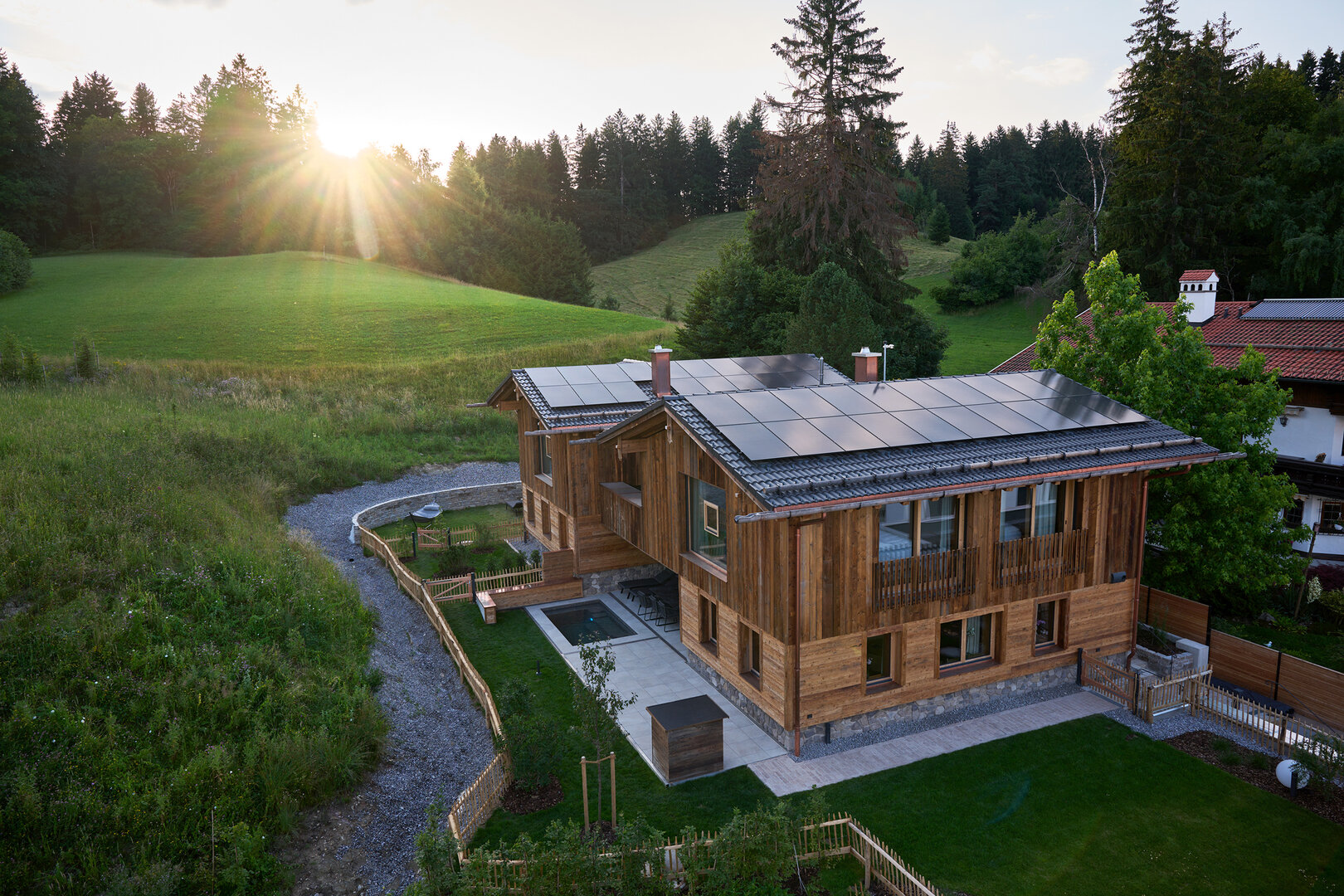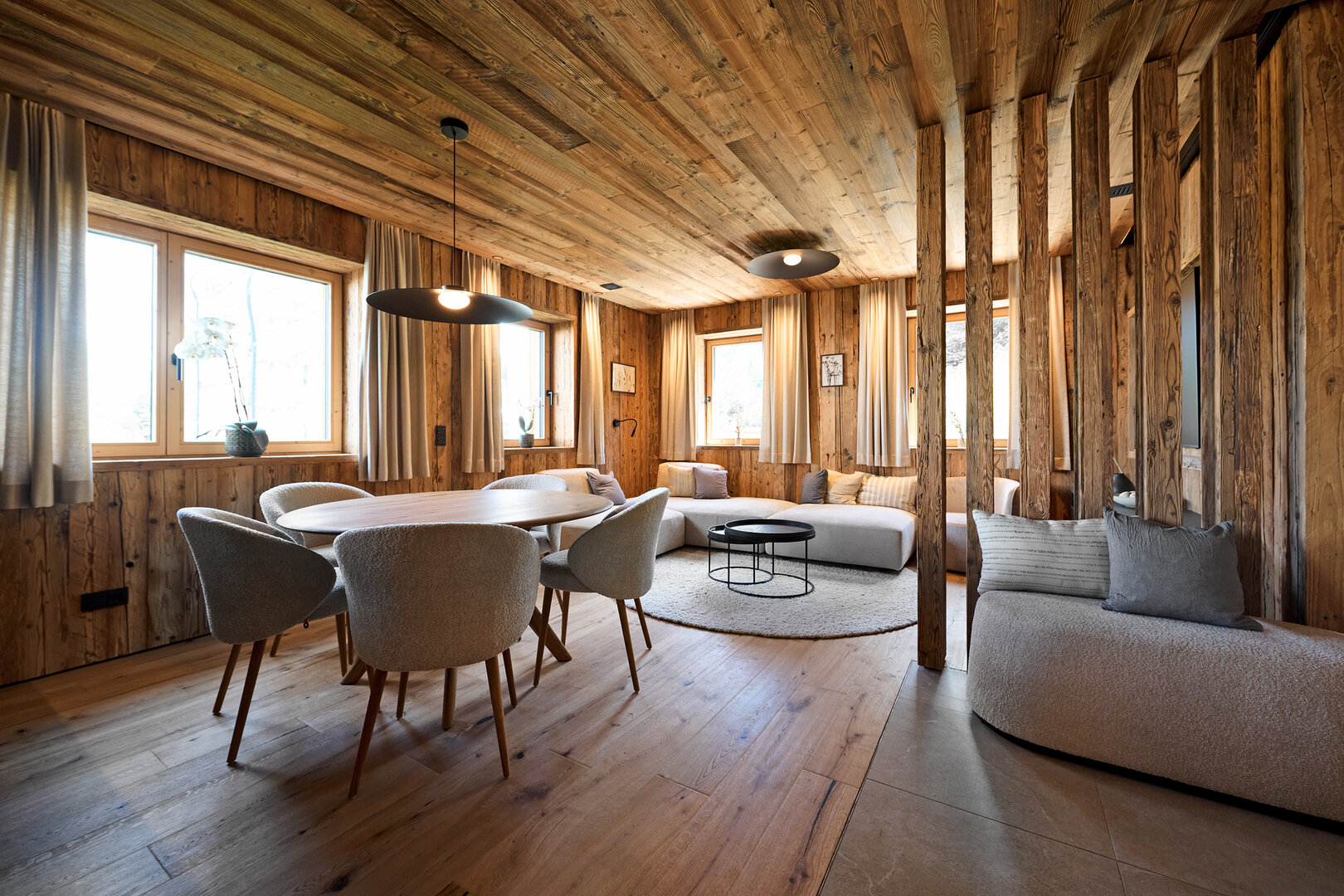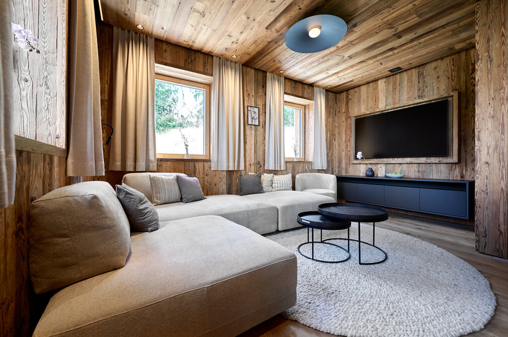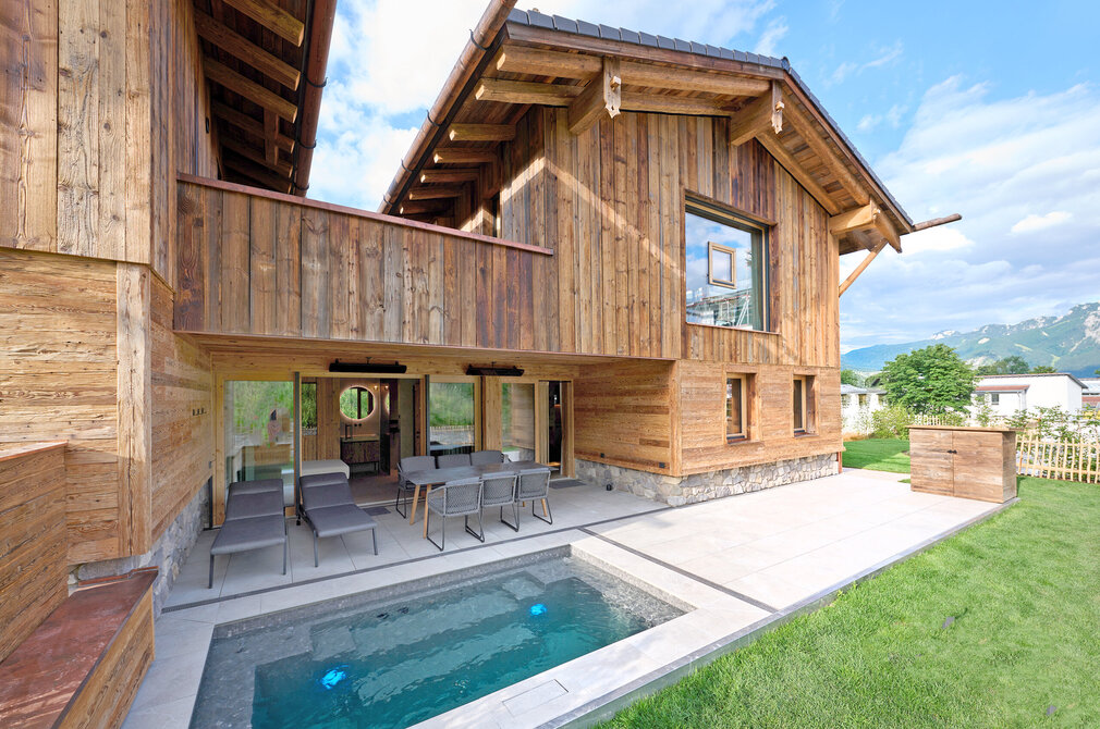 Die 5-Sterne-zertifizierten Chalets verbinden das Beste aus zwei Welten: Rückzug und Geborgenheit wie auf einer Hütte mit der Nähe zu Restaurants, Cafés und dem kulturellen Leben der Stadt. Schon die Anreise ist entspannt, die überdachten Parkplätze liegen direkt unterhalb der beiden Häuser. Ein paar Stufen nach oben und schon ist man in einem anderen Universum: Warmes Altholz, edle Materialien, klare Linien, modernste Technik. Thomas Scheibel hat nichts dem Zufall überlassen und alles bis ins kleinste Detail durchdacht, so können Eltern zum Beispiel vom Essbereich und von der Sauna aus den Pool im Blick behalten, wenn die Kinder im Freien sind.