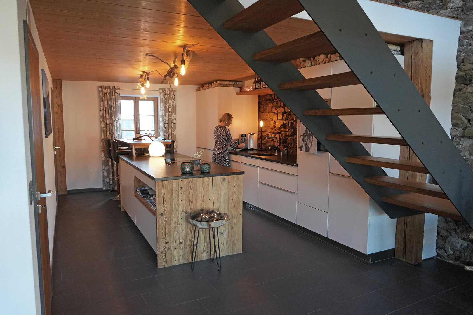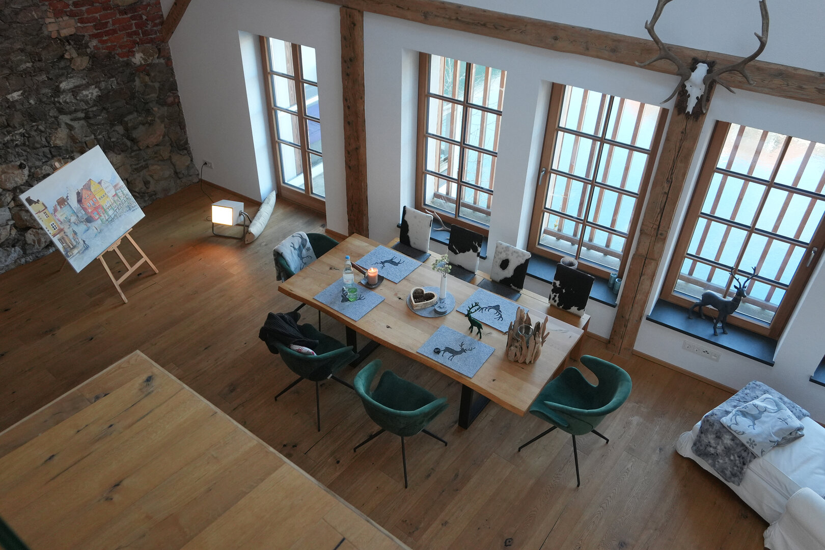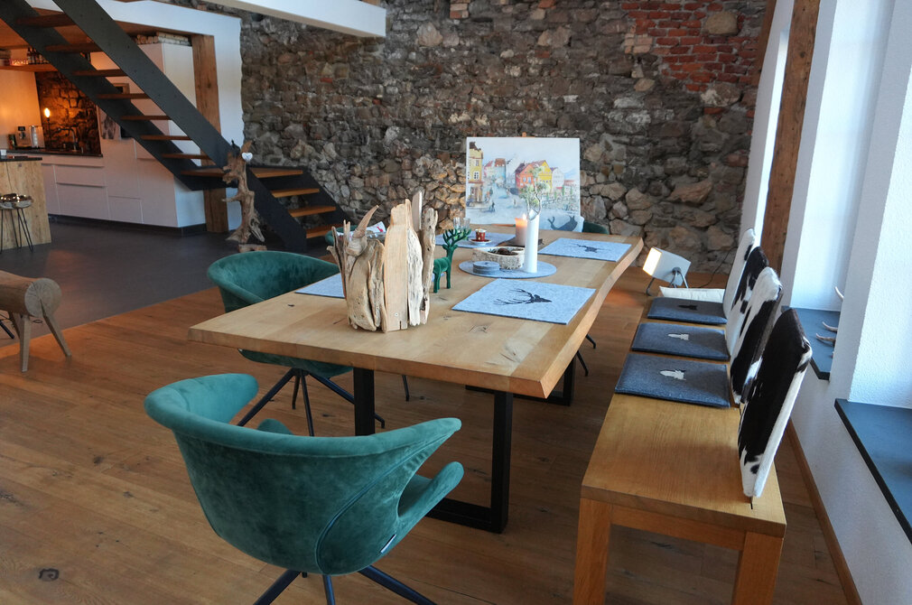 Fassade und Dach des Gebäudes sind denkmalgeschützt und restauriert. Auch im Innern hat die Vorbesitzerin von Viktoria Mayer alles aufwändig saniert und zudem wertvolle Details herausarbeiten lassen, um den historischen Charme der Räume zu erhalten. So ist der loftartige Charakter der Wohnung von den Holzbalken geprägt, an denen sich vor der Sanierung schon der Holzwurm zu schaffen gemacht hatte und an mehreren Wänden sind die Lechbruchsteine der alten Mauer freigelegt. „Manchmal sehen die Steine aus, also seien sie nass, aber das ist glücklicherweise nicht der Fall. Sie wirken einfach so intensiv und solche Details machen das Haus richtig lebendig", meint die Gastgeberin, die sich immer wieder neu für diese sichtbaren Spuren der Baugeschichte begeistern kann.