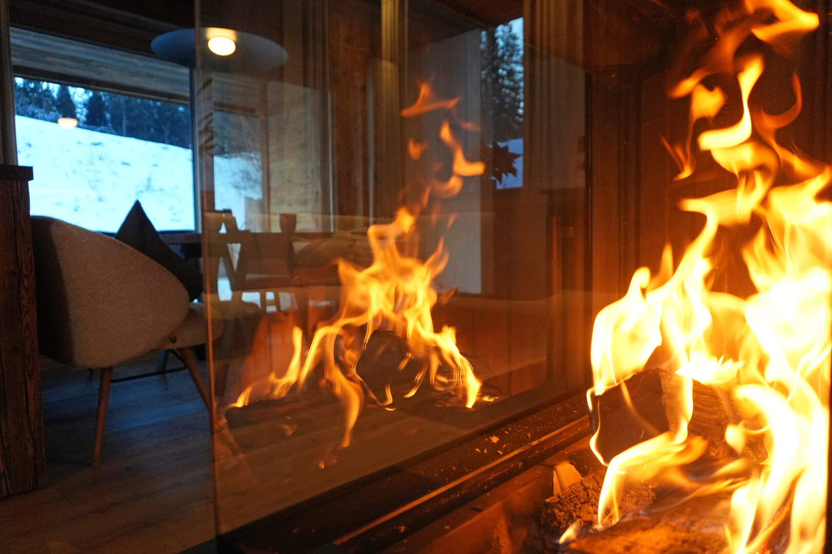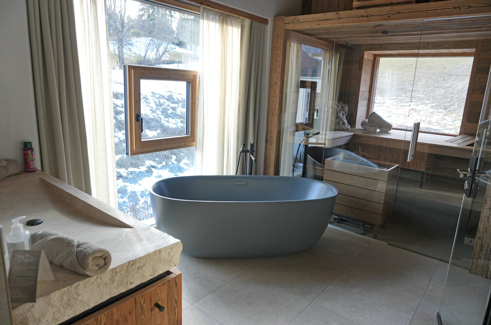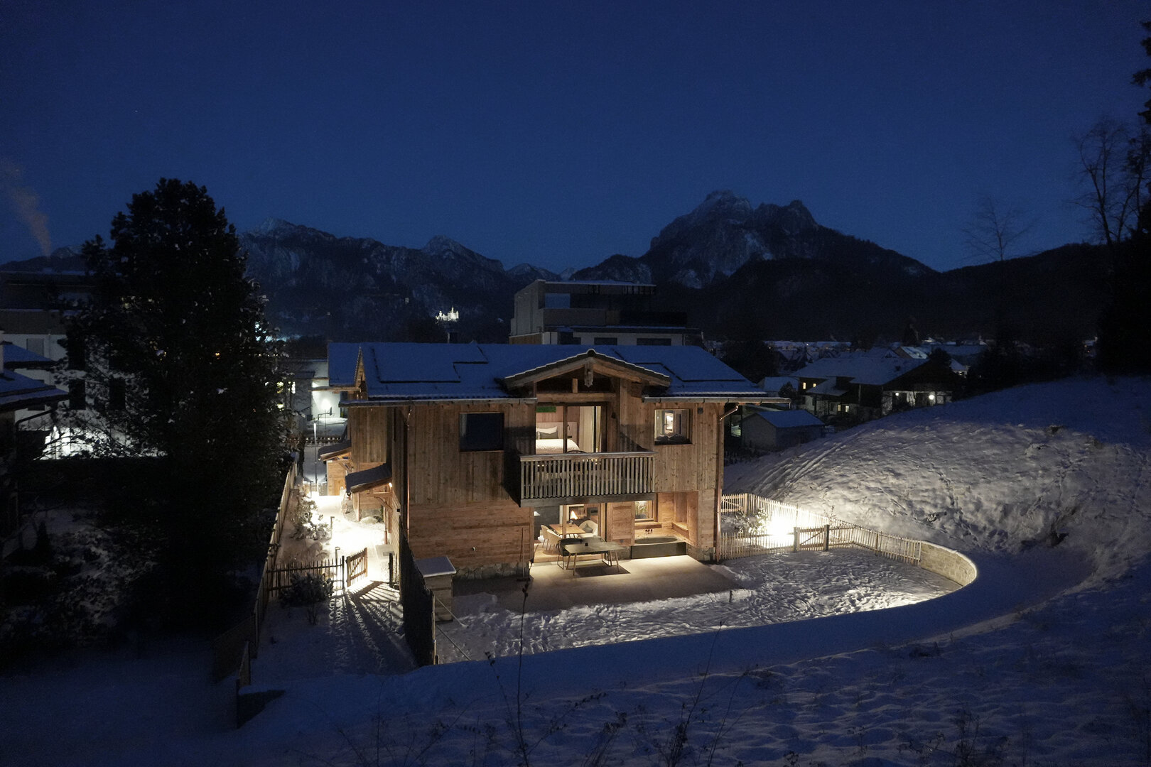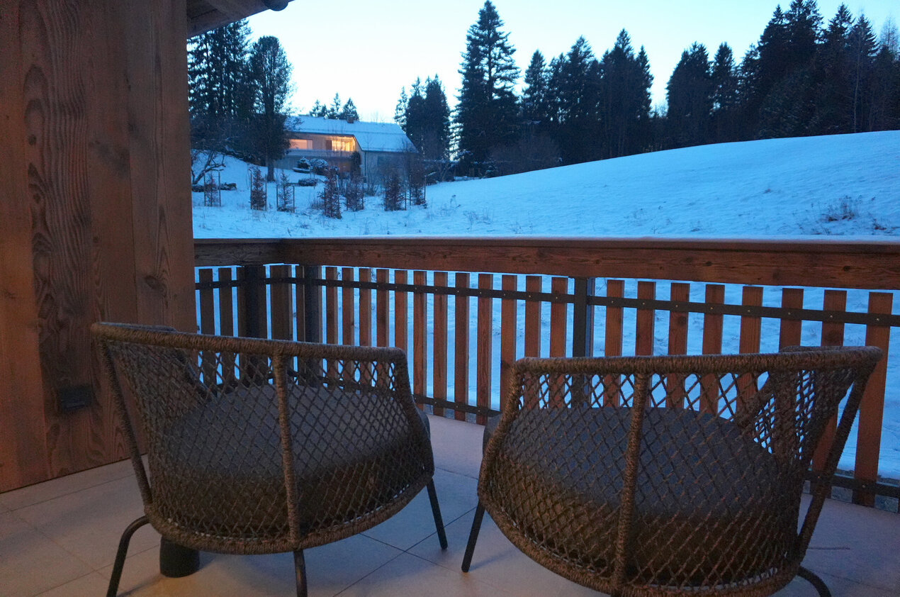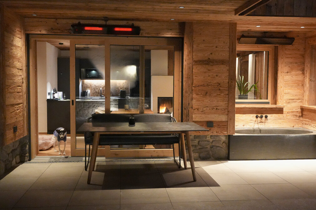 Als sich der Tag langsam zum Ende neigt, huschen vor dem Haus Rehe durch den Schnee. Auf der Terrasse ist es jetzt ganz still - und dank der Außen-Infrarotstrahler sogar warm. Zwar bleibt die aus Naturstein geschlagene Außenbadewanne wärmeren Jahreszeiten vorbehalten, dafür genießen die Gäste des Chalets Schlossblick im Winter den auf 30 Grad geheizten Outdoor-Pool.