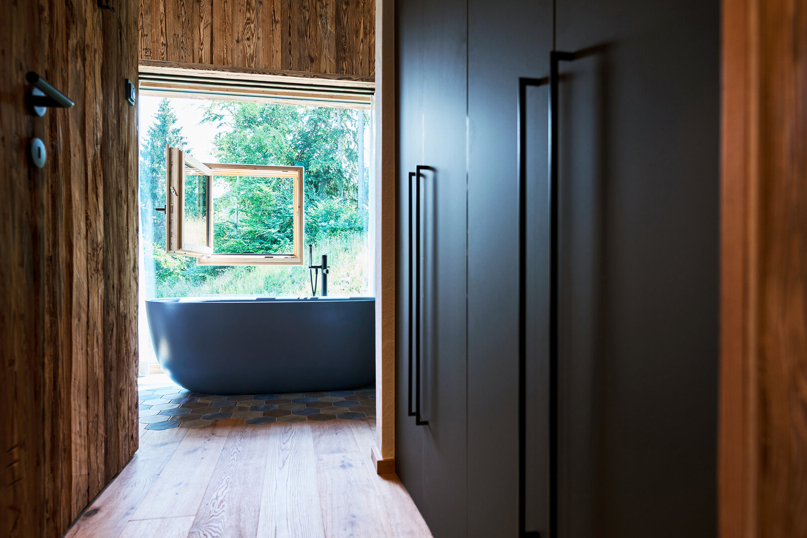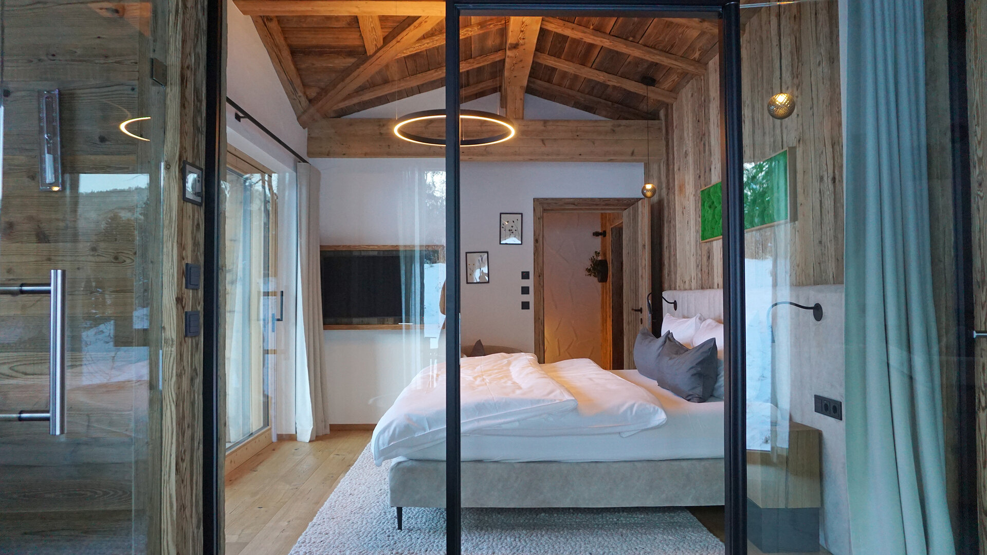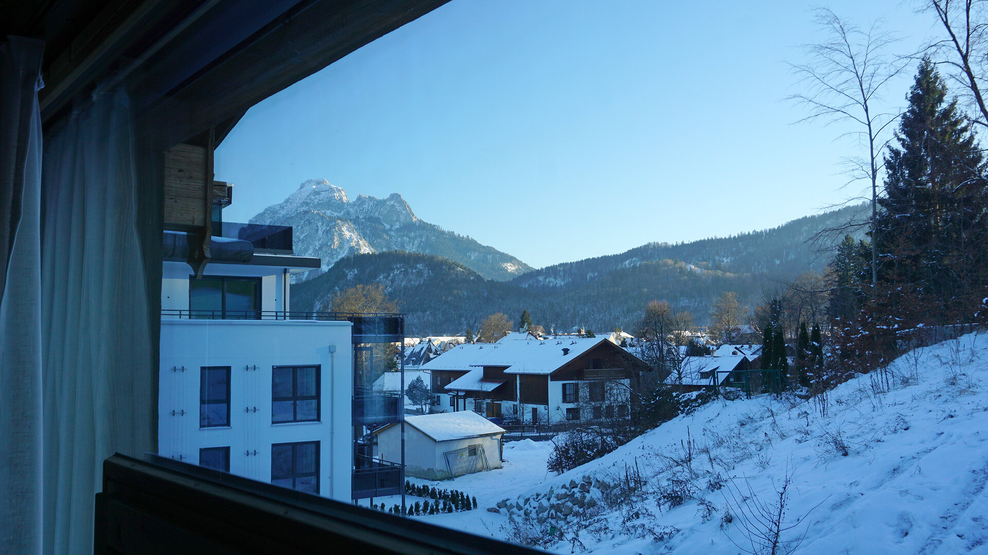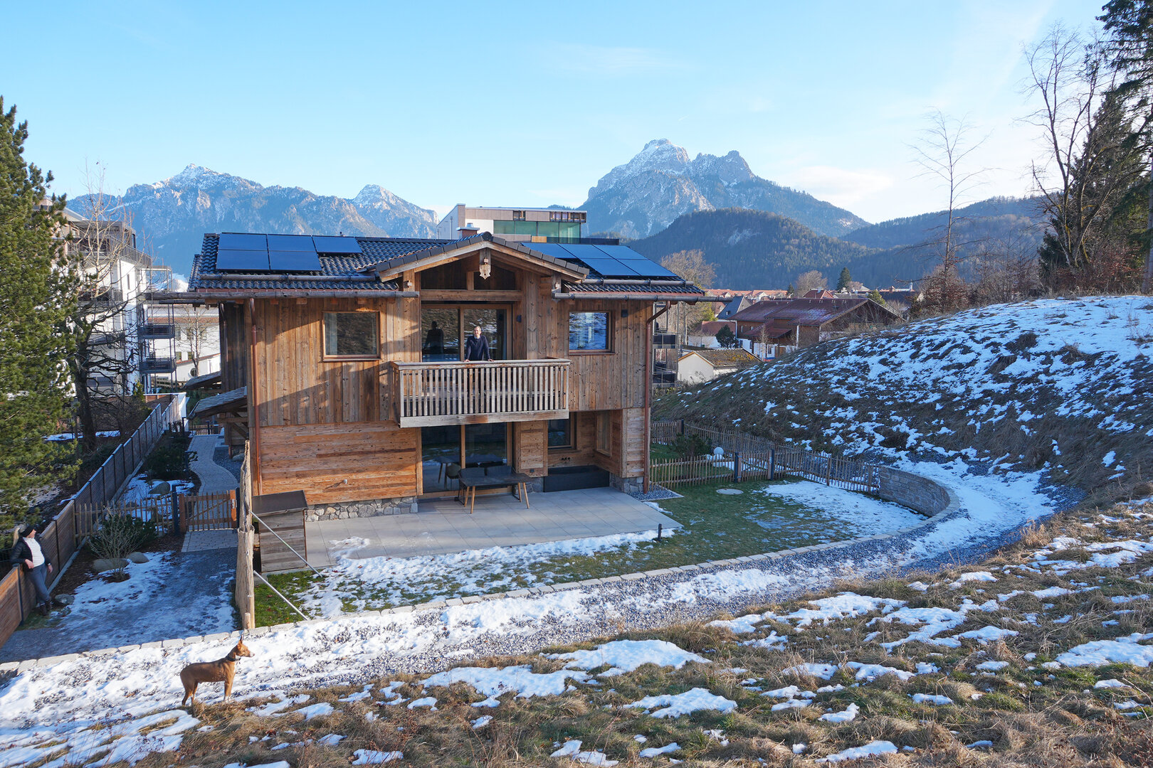 Der größte Luxus sind die großen Panoramafenster – sie holen die Natur mitten hinein in die kaminbeheizte Stube: Landschaftskino vom Sofa, vom Bett, von der Badewanne oder der Sauna aus. Scheibel hat extra ein Grundstück zusätzlich erworben, damit der Blick auch in Zukunft unverbaut bleibt. Der Name der beiden Häuser ist übrigens wörtlich zu nehmen: Vom Chalet Schlossblick ist mit Neuschwanstein das Schloss der Schlösser zu sehen, vom Chalet Waldblick der Forst in Richtung Galgenbichl, ein artenreiches Naturkleinod mit Geschichte.