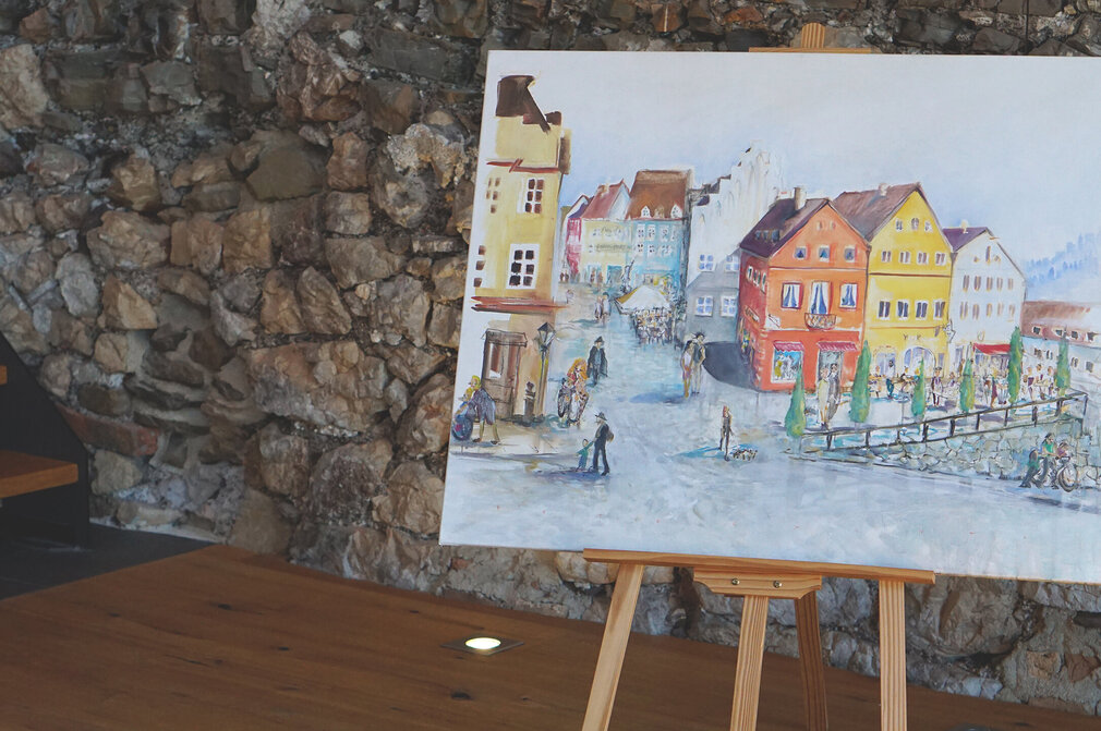 Viktoria Mayers Gäste genießen vom kleinen Balkon aus einen traumhaften Blick auf die historische Klosteranlage St. Mang, den Lech und weiter flussabwärts auf das Füssener Franziskanerkloster. „Hier abends zu sitzen und dem fließenden Wasser zuzuschauen, macht einen ganz leicht und frei", meint Mayer und lächelt. Vor allem die Verbindung von Stadt und Natur gefällt ihr: „Ich mag es zwar ländlich, aber ein bisschen Stadt brauche ich auch und Füssen hat genau die richtige Größe. Ich kann hier einfach zu Fuß ins Restaurant oder Café und in den schönen Läden einkaufen gehen. Deshalb stammt ein Großteil meiner Deko-Objekte aus Füssen und von einem hier beheimateten Künstler habe zwei Stadtansichten malen lassen, die jetzt in der Wohnung hängen."