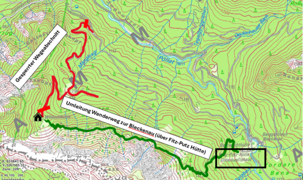 Vor Ort ist eine Umleitung für Wandernde ausgeschildert. Diese verläuft vom Säuling kommend über die Fritz-Putz Hütte und die Bleckenau. Eine Karte über den gesperrten Bereich und die Umleitungsroute findest Du hier verlinkt.